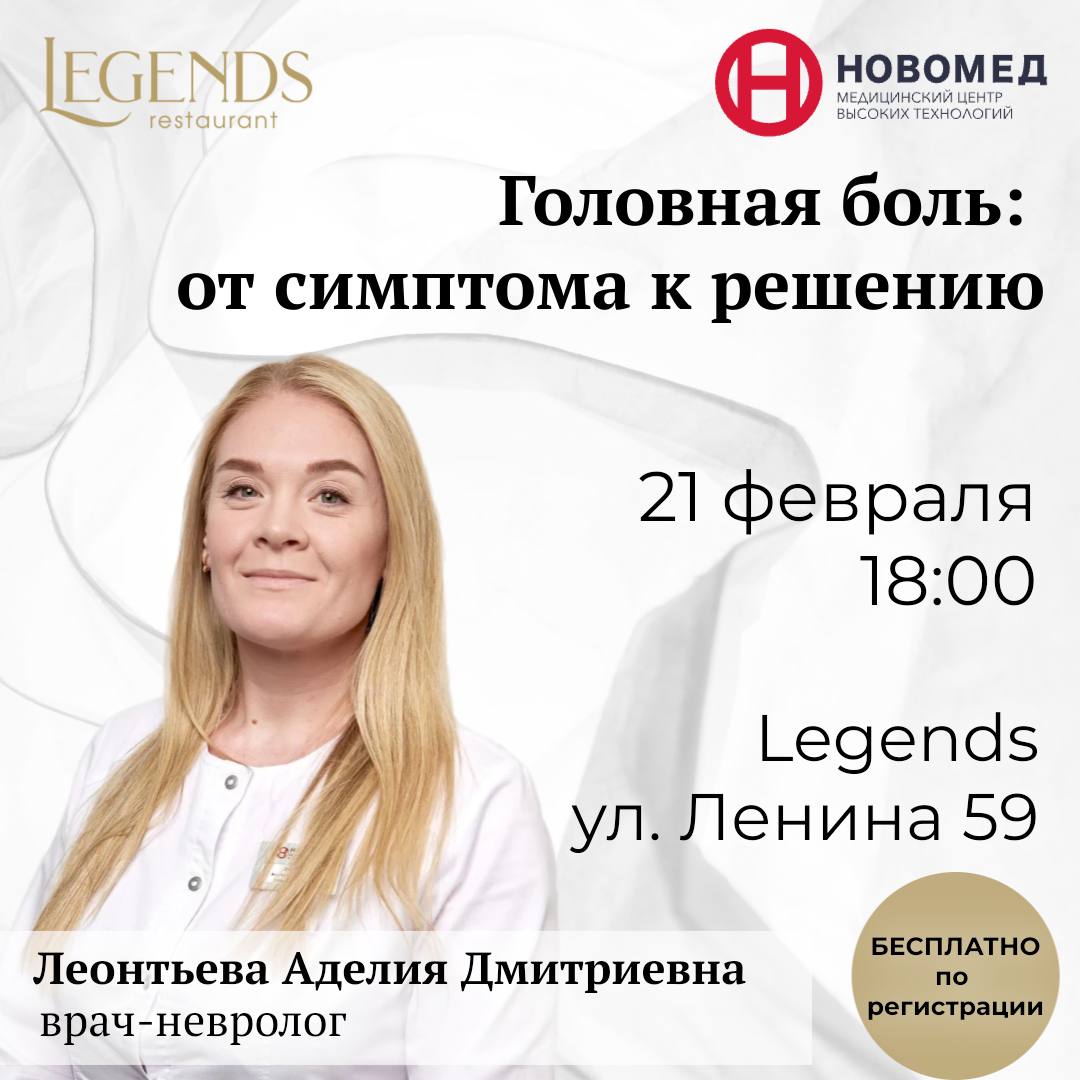 Медицинский центр «НовоМед» приглашает на камерную встречу с врачом-неврологом Леонтьевой Аделией Дмитриевной в атмосфере ресторана Legends.